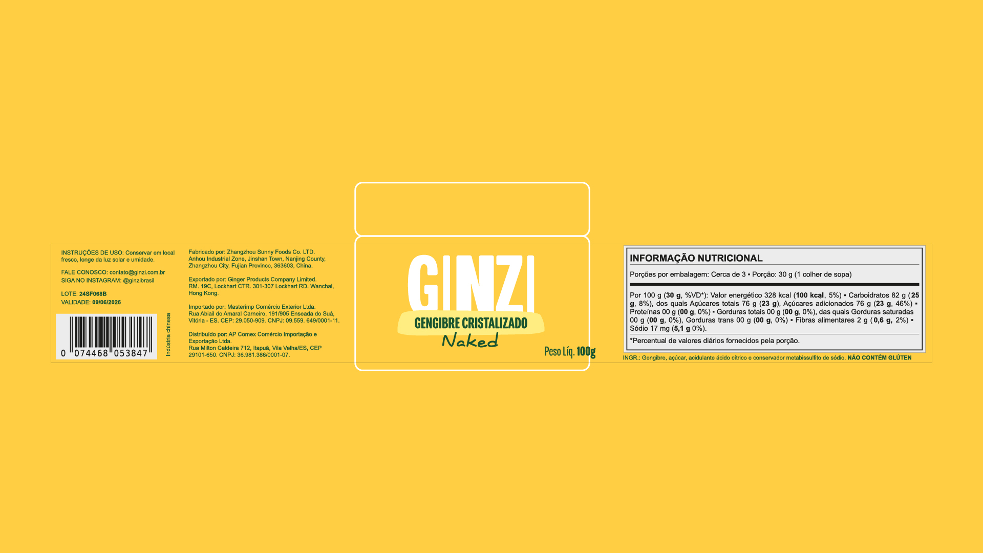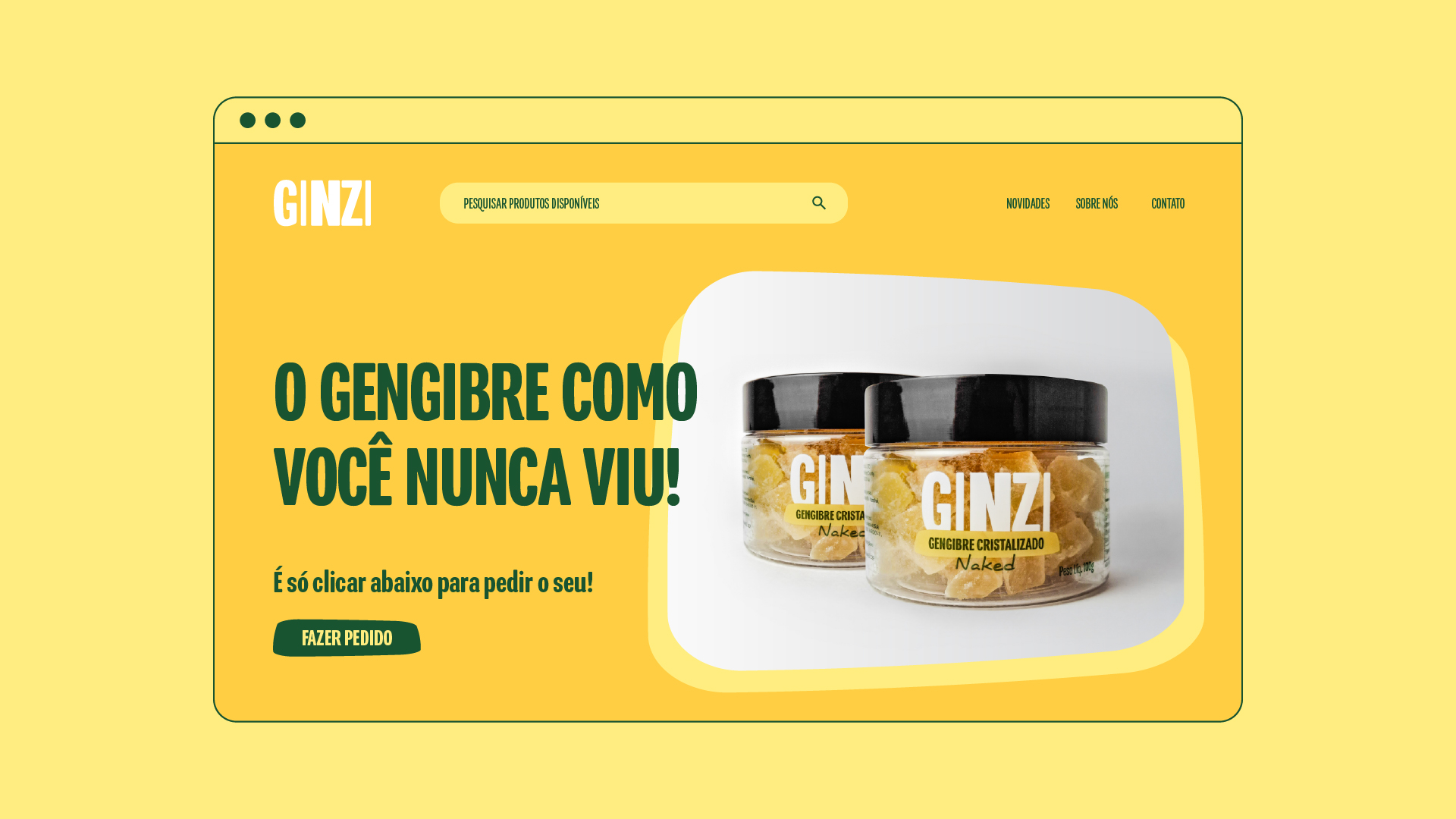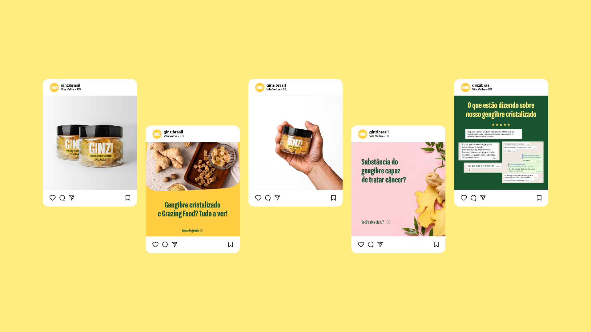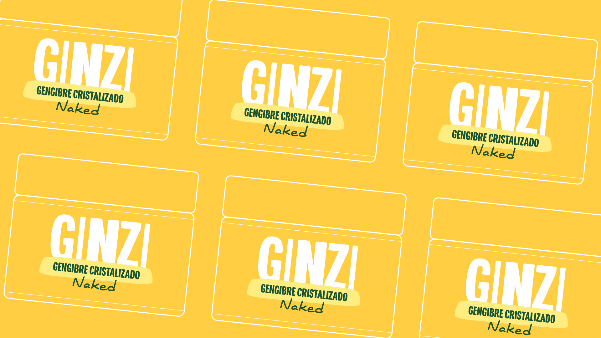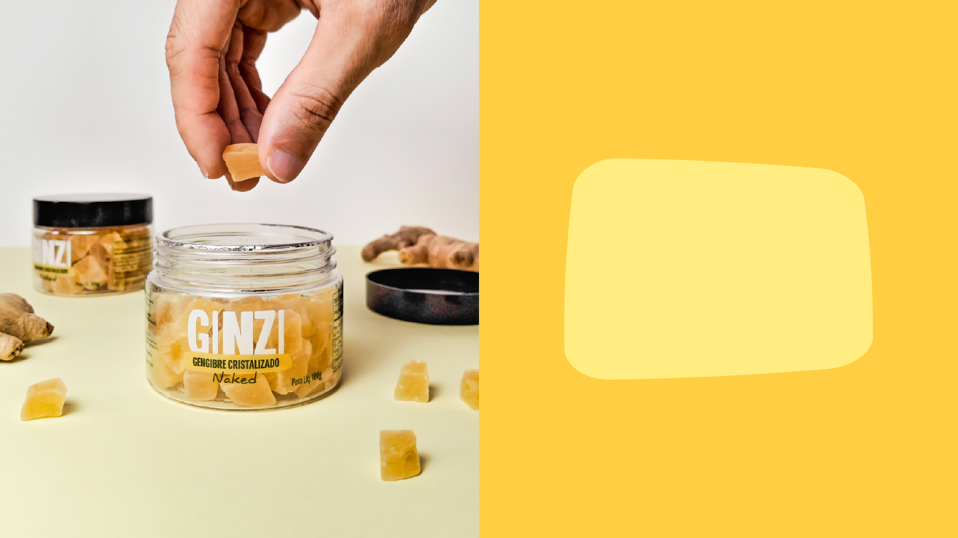 Utilizamos tons de cores que remetem diretamente ao produto, lembrando “pepitas de ouro”. Além disso, desenvolvemos sistemas visuais e layouts inspirados nos formatos do gengibre cristalizado, incorporando essas formas nos elementos da identidade.
